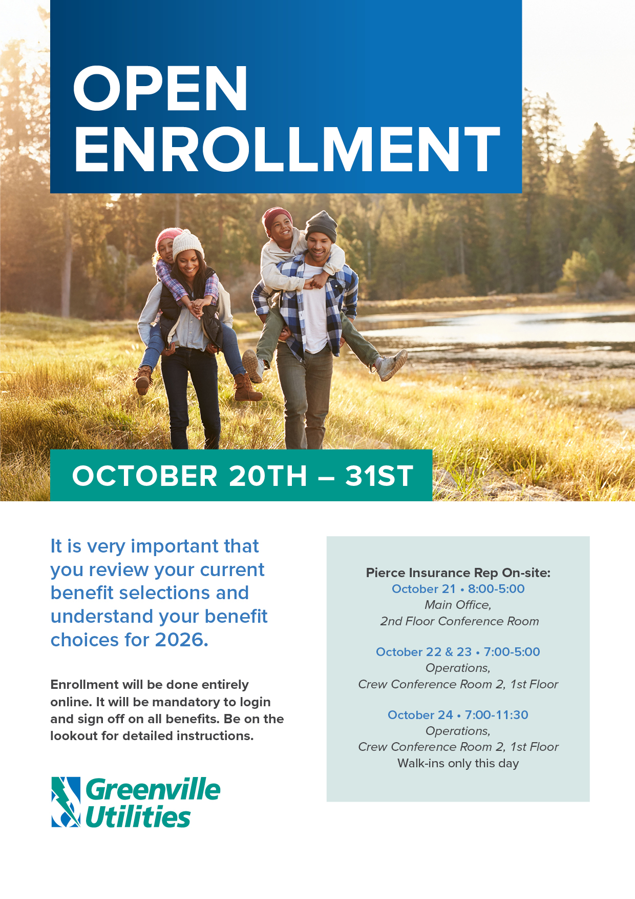 Representatives from Pierce Insurance will be on-site to help employees on October 21st - 8 a.m. to 5 p.m. at the Main Office; October 22nd and 23rd from 7 a.m. to 5 p.m. at Operations, Crew Conference Room 2, 1st Floor; and on October 24th from 7 a.m. to 11 a.m., walk-ins only, at Operations, Crew Conference Room 2, 1st Floor. Leah also stressed that while employees are checking on their health insurance coverage, they should also check their beneficiaries. She said sometimes life and living situations change, and when it does, it’s important to make the necessary beneficiary changes.